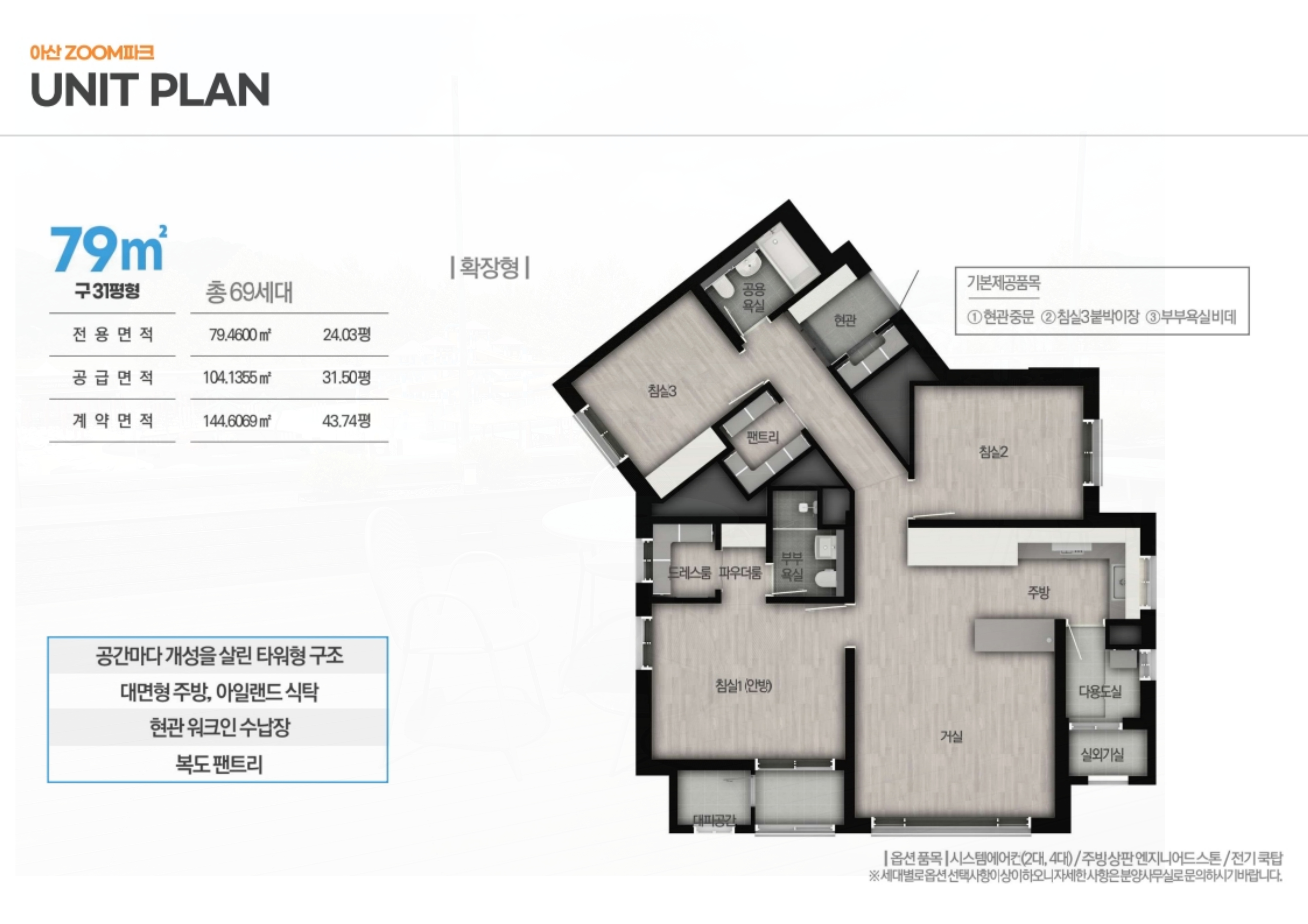 79 타입: 타워형 구조로 채광 및 통풍이 우수하며, 넓은 거실 팬트리 공간과 현관 창고를 제공하여 수납 효율성을 강화했다고 합니다.