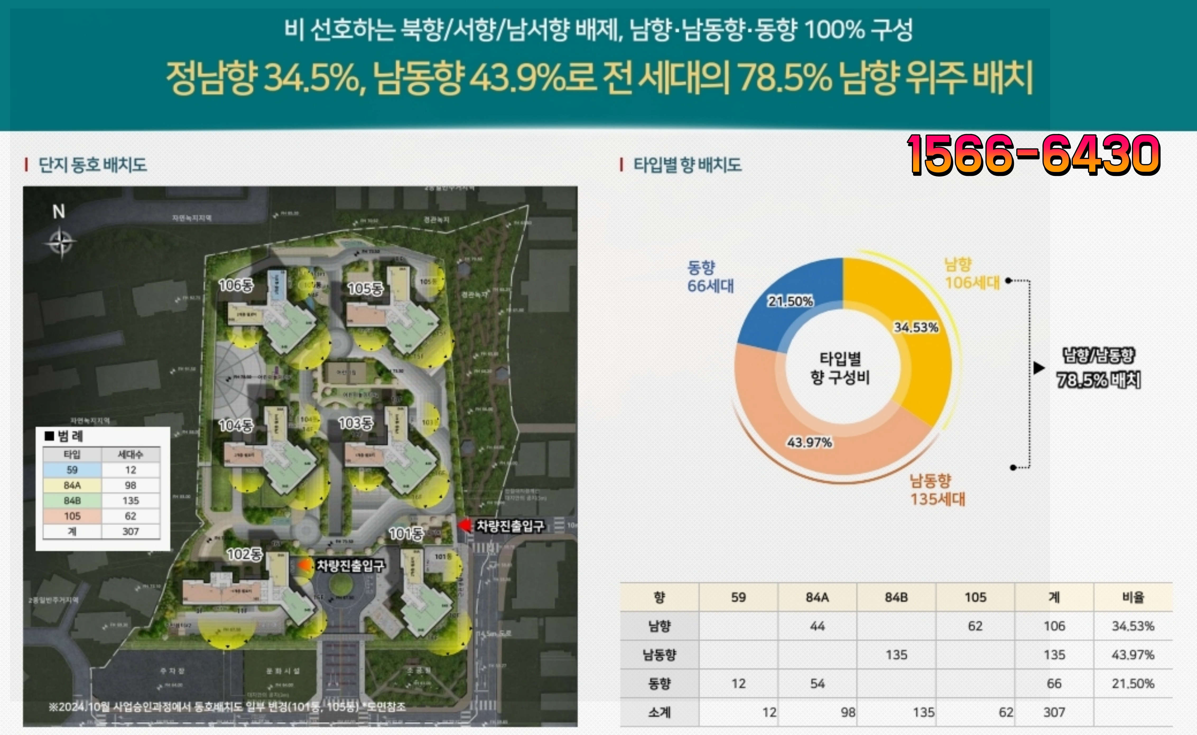 이 단지는 전체 가구의 약 78.5%가 남향 또는 남동향을 바라보도록 배치되어 풍부한 채광과 일조량을 확보합니다.