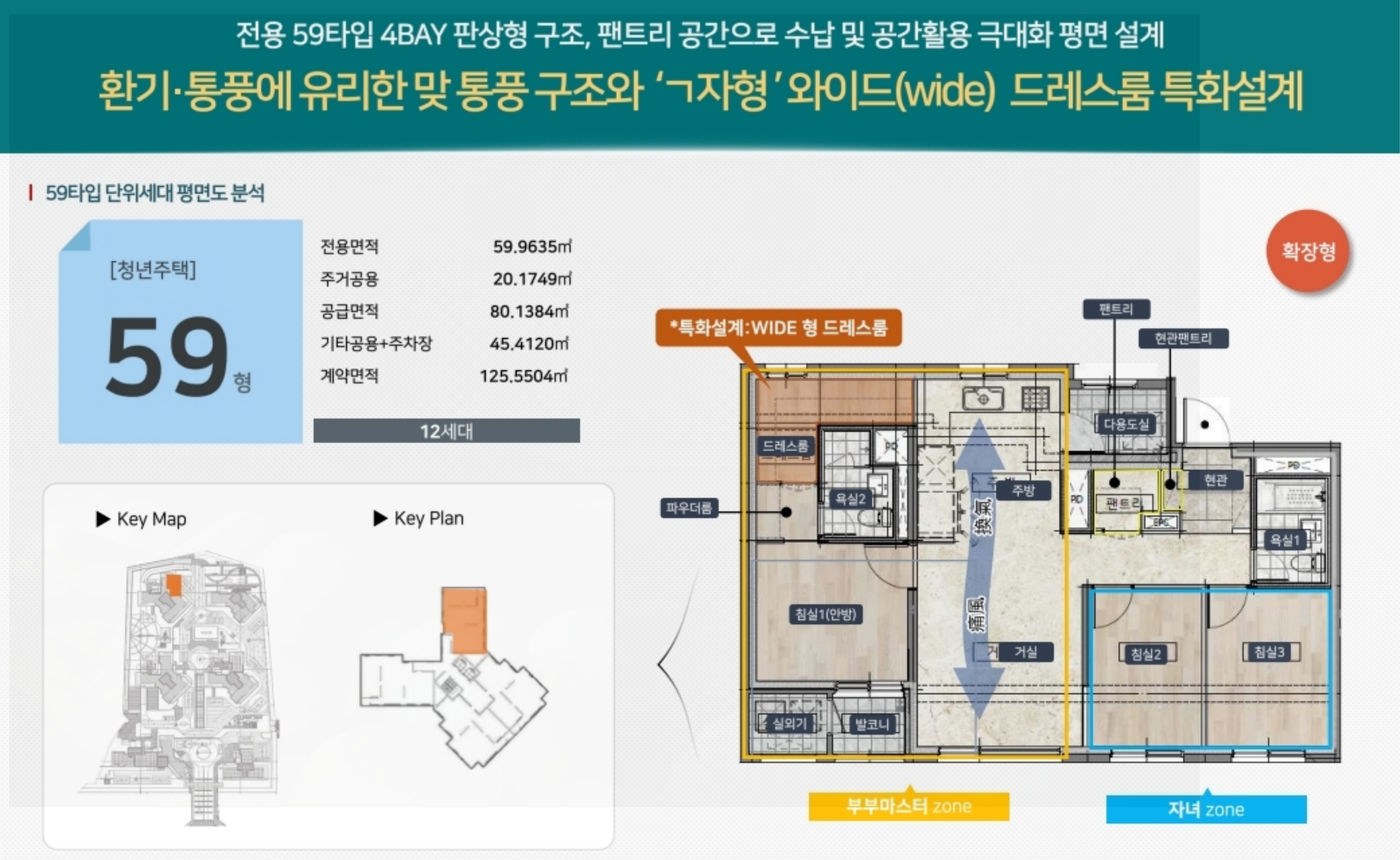 전용 59㎡ 타입: 4베이 판상형 구조에 팬트리를 포함하여 공간 활용도를 극대화했습니다. 'ㄱ'자형 와이드 드레스룸과 맞통풍 구조는 실용성과 쾌적함을 동시에 제공합니다.
