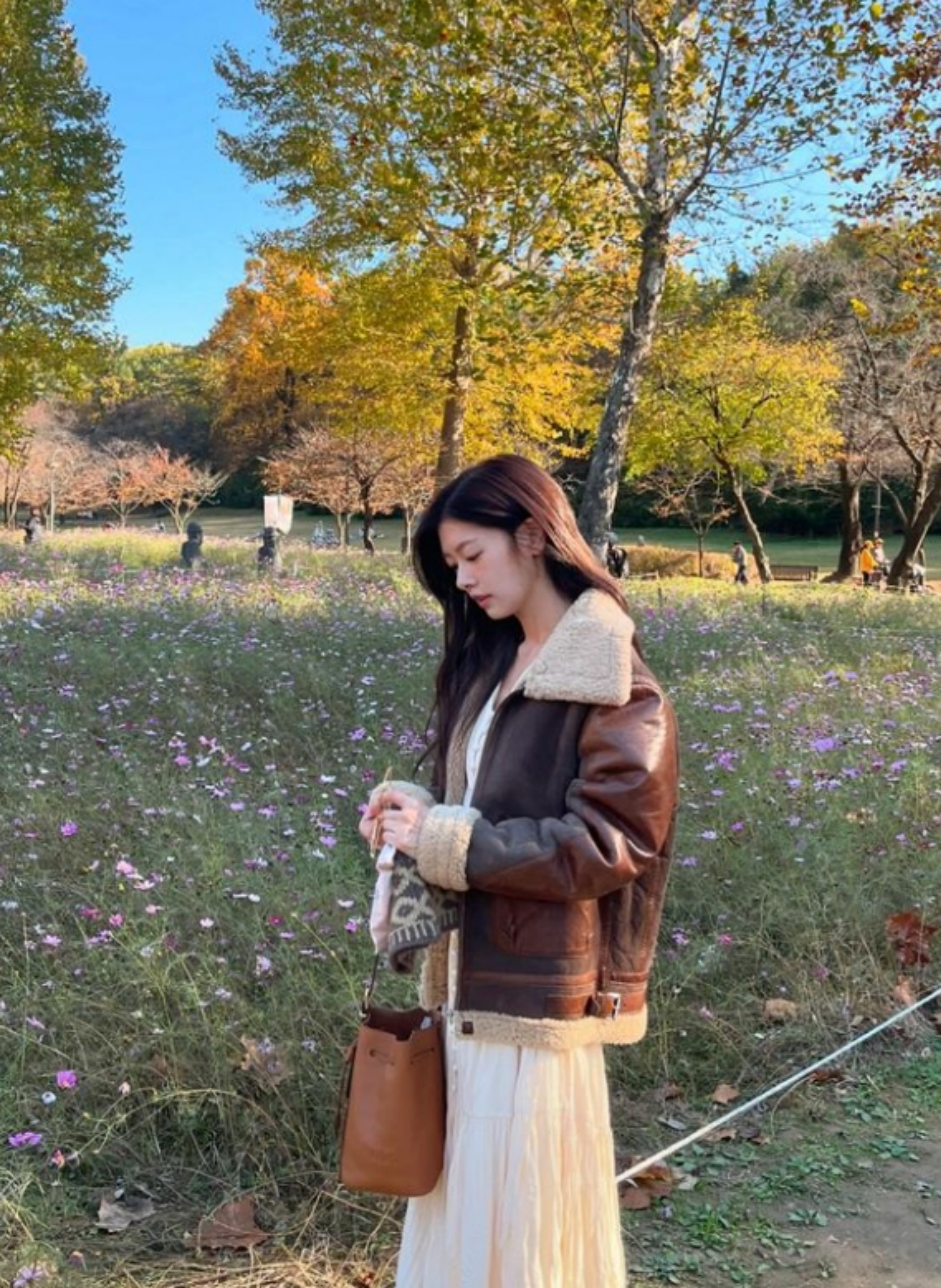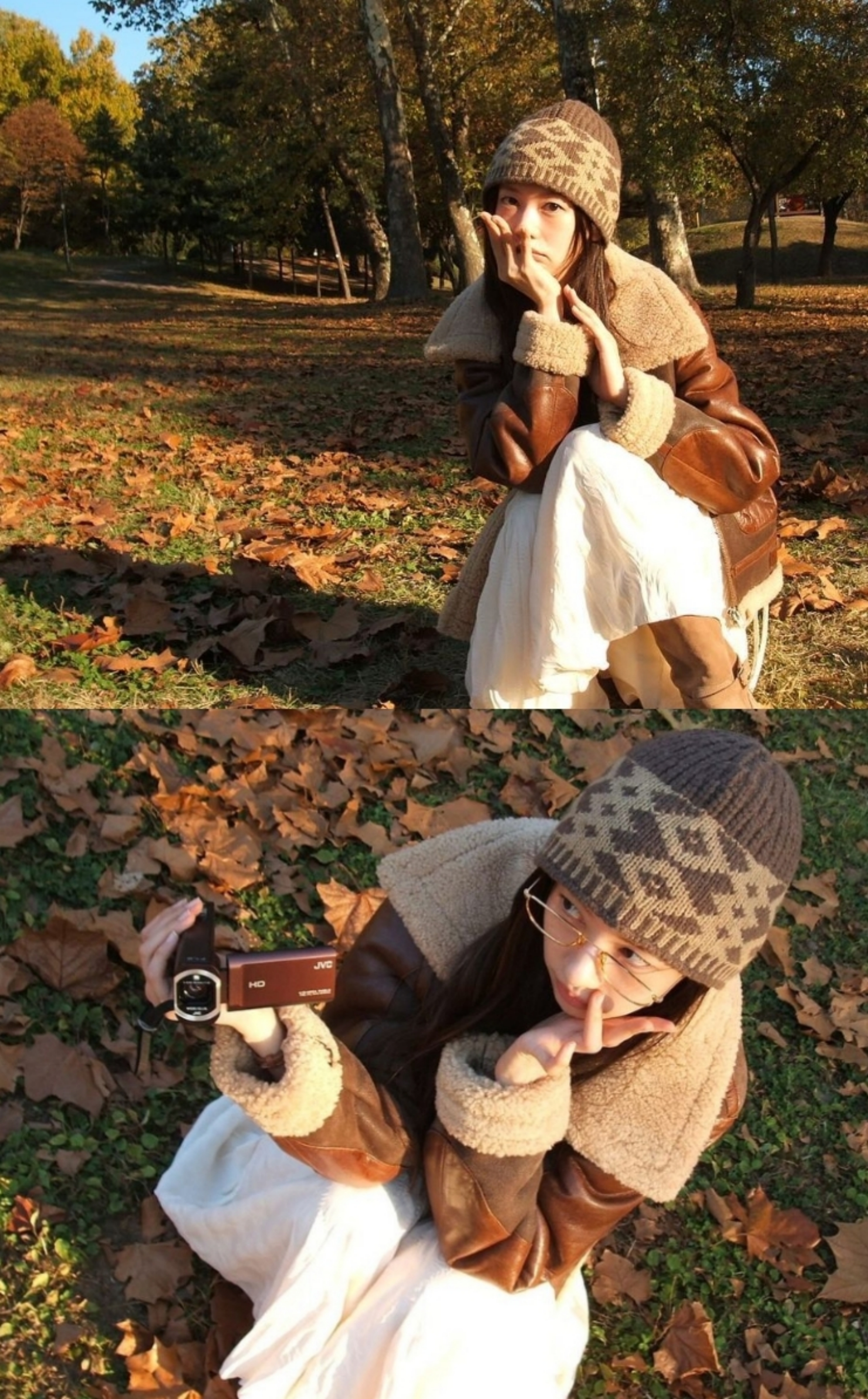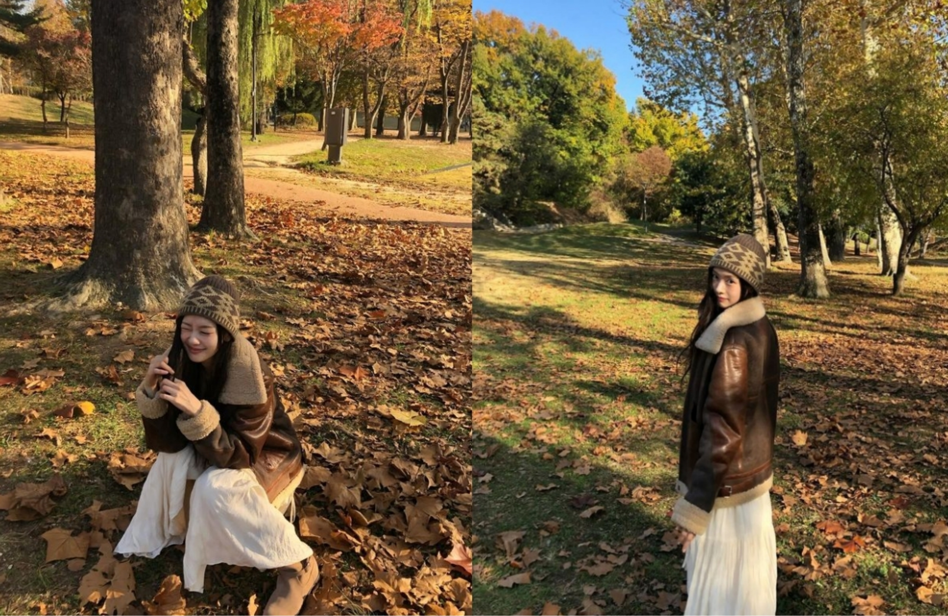 이날 정소민은 화이트 컬러의 벨티드 원피스에 부츠, 짙은 브라운 컬러의 무스탕과 숄더백과 비니까지 낙엽을 배경으로 찍어서 가을의 분위기가 물씬 풍기는 모습이었는데요.