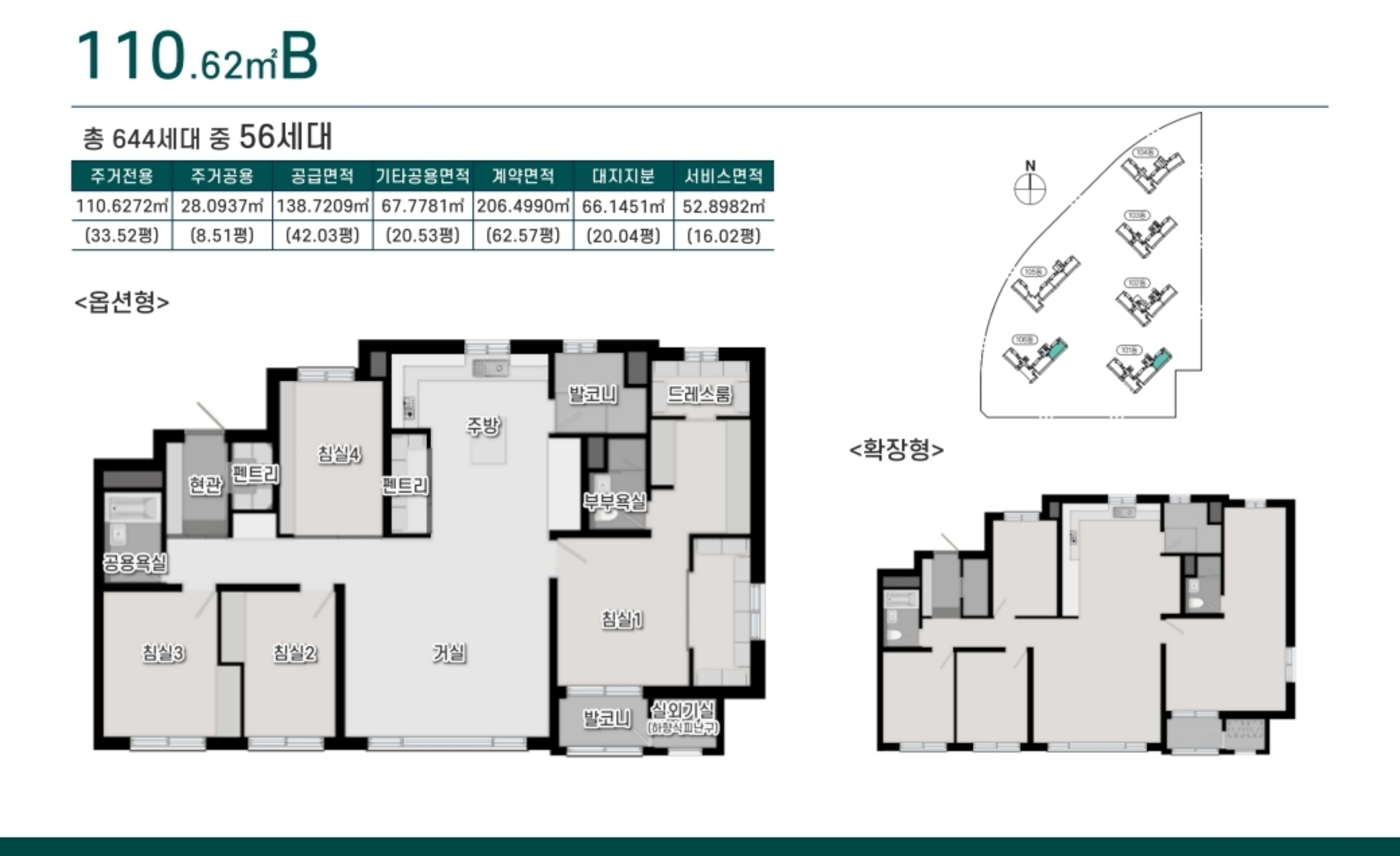 총 644세대 중 전용면적 84㎡가 주력 평형으로, 110㎡, 121㎡, 146㎡의 다양한 평형이 함께 공급되어 다양한 라이프스타일에 대응합니다.