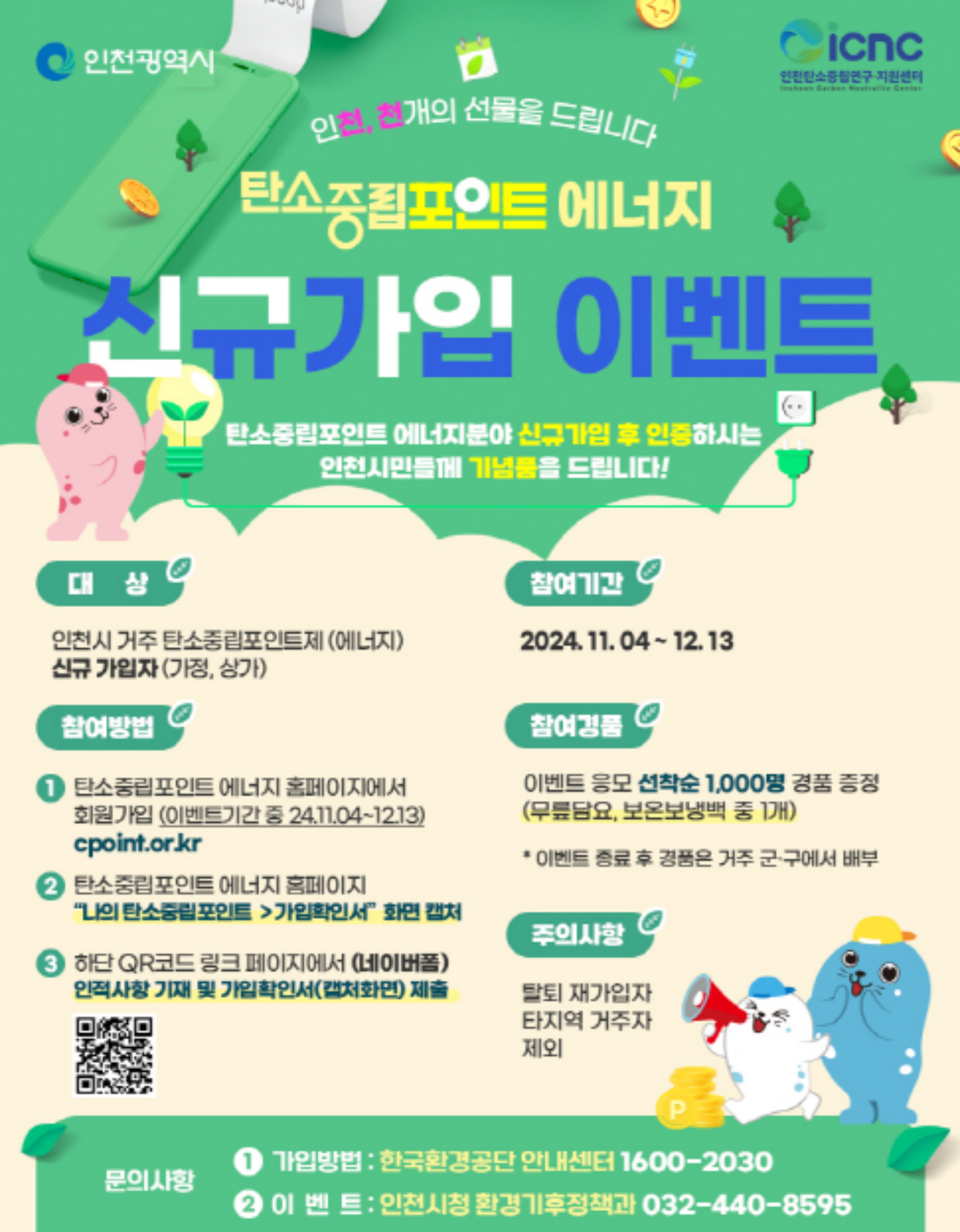 인천광역시가 탄소중립연구지원센터와 공동으로 탄소중립포인트제 신규 가입 이벤트를 진행한다고 밝혔다.