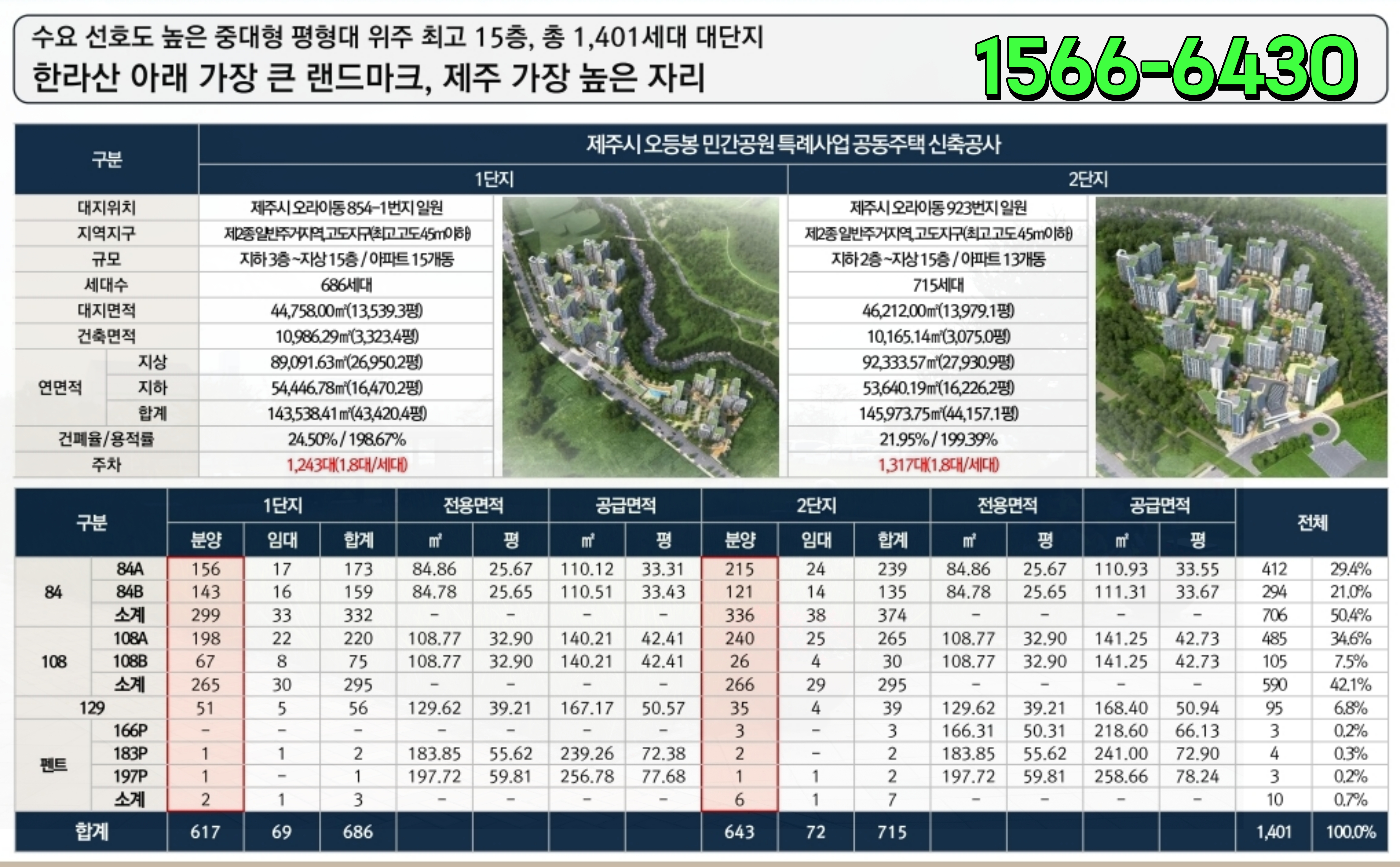 두 단지를 합하면 총 1,401세대로 대형 단지인만큼 제주라는 특성을 고려해 매우 관심을 받기에 충분해 보입니다.
