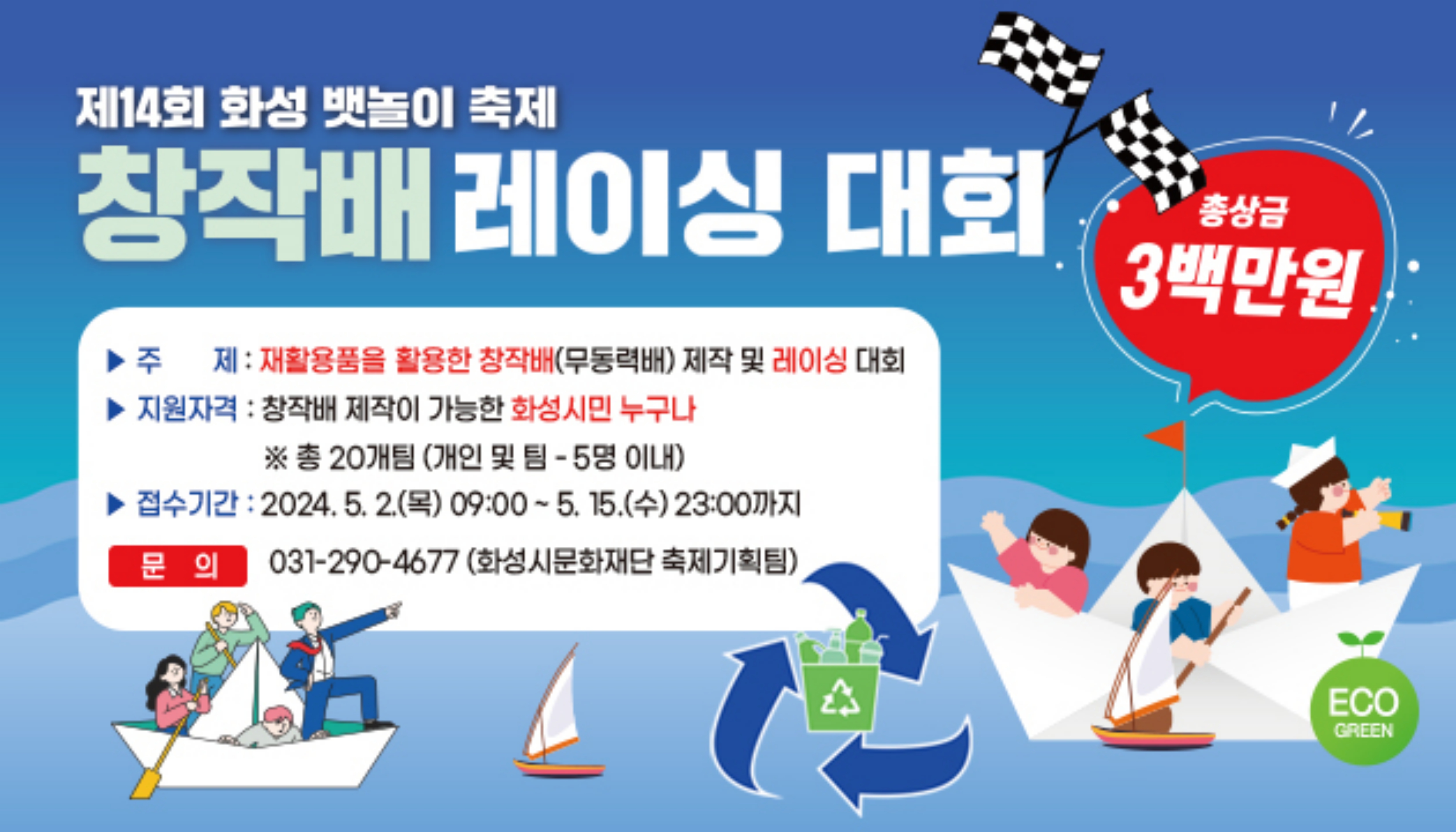 화성시문화재단은 제14회 화성 뱃놀이 축제 창작배 레이싱 대회를 함께 꾸려갈 참가팀을 모집한다고 밝혔다.
