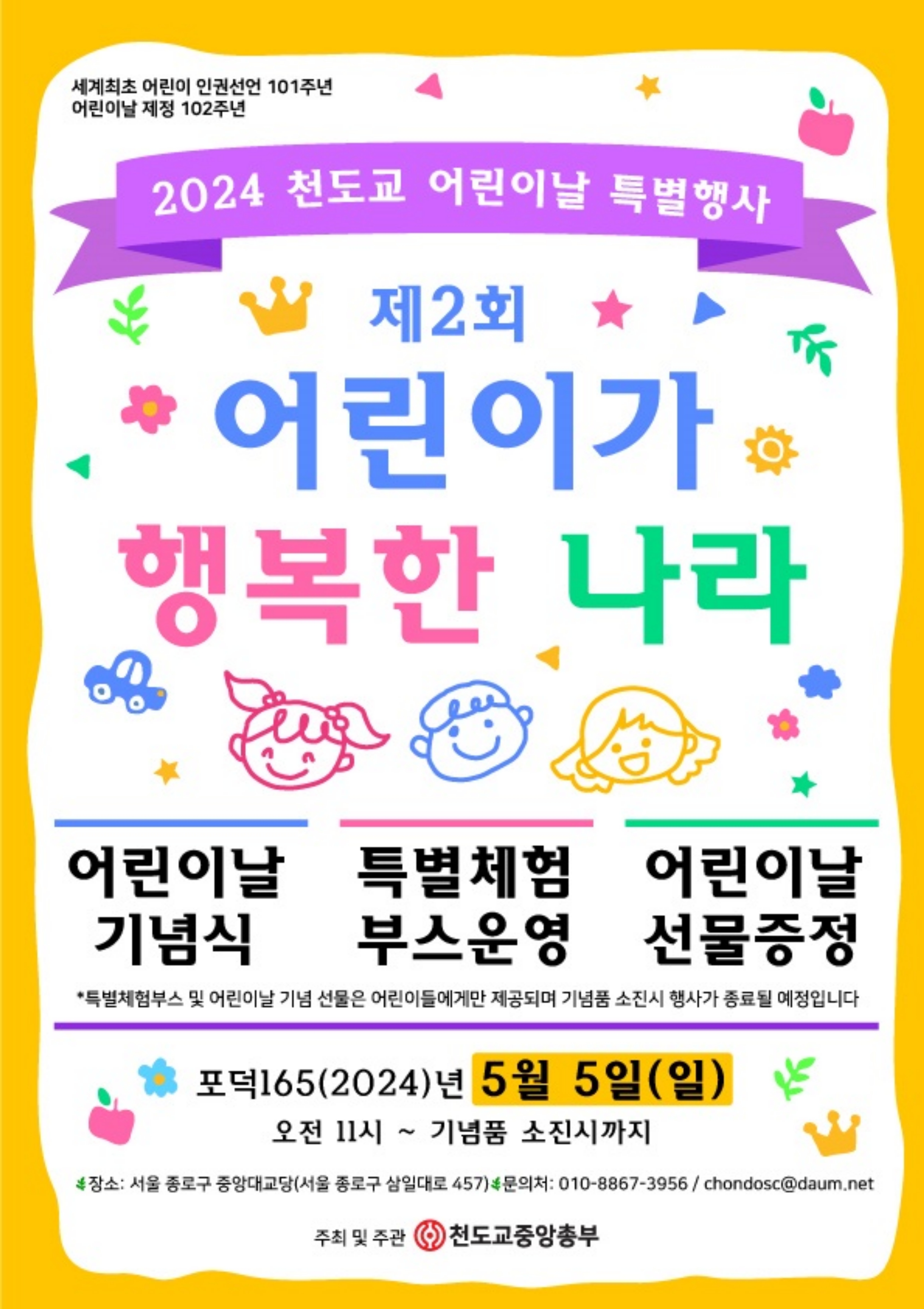 천도교중앙총부(이하 천도교)는 5월 5일(일) 어린이날을 맞아 서울 종로구 경운동 중앙대교당 일대에서 제2회 어린이가 행복한 나라를 개최한다.