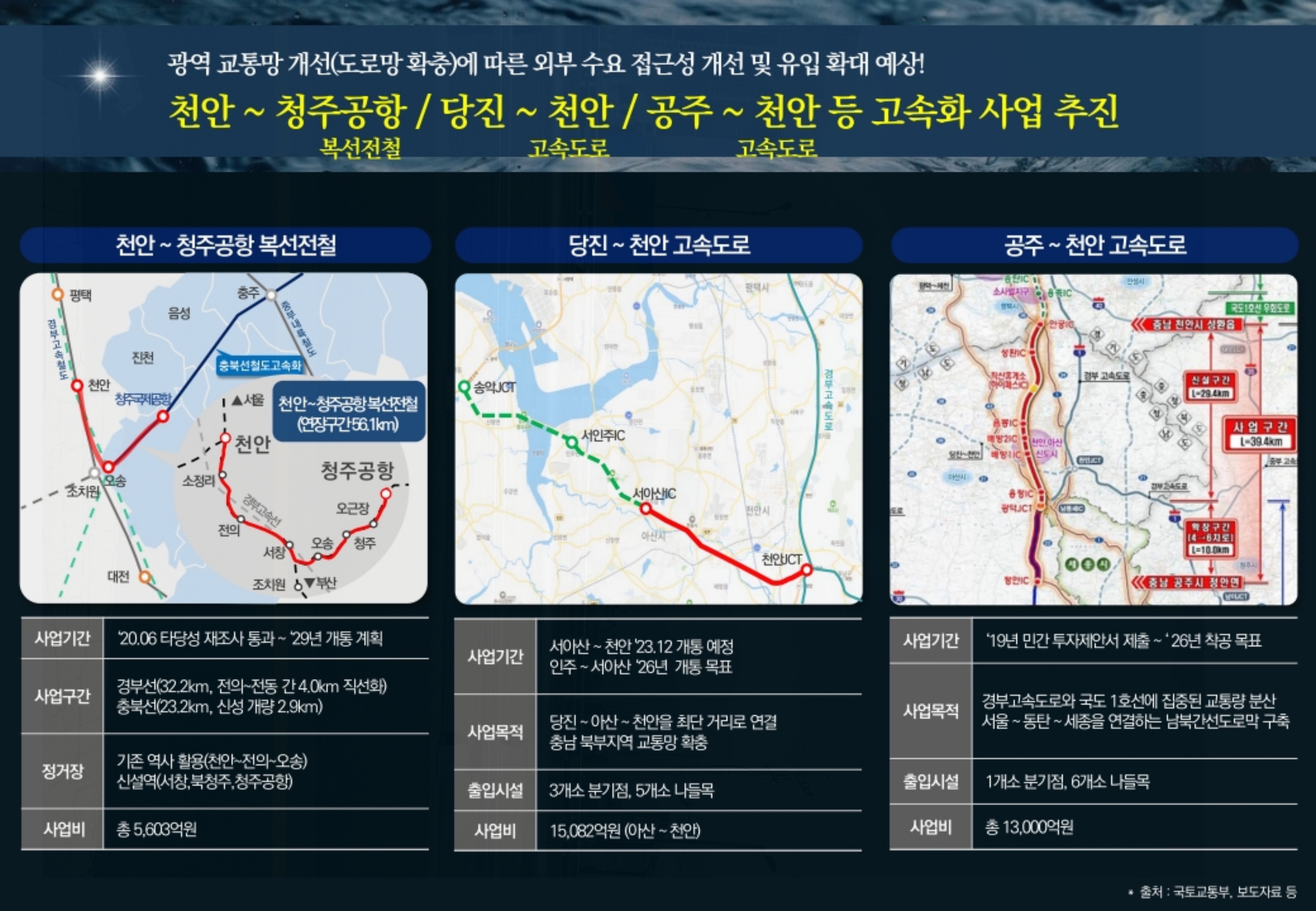 교통의 요지에 자리한만큼 지역 이동은 물론 천안 IC 및 북천안 IC를 통해 경부고속도로의 진출입이 매우 용이합니다.