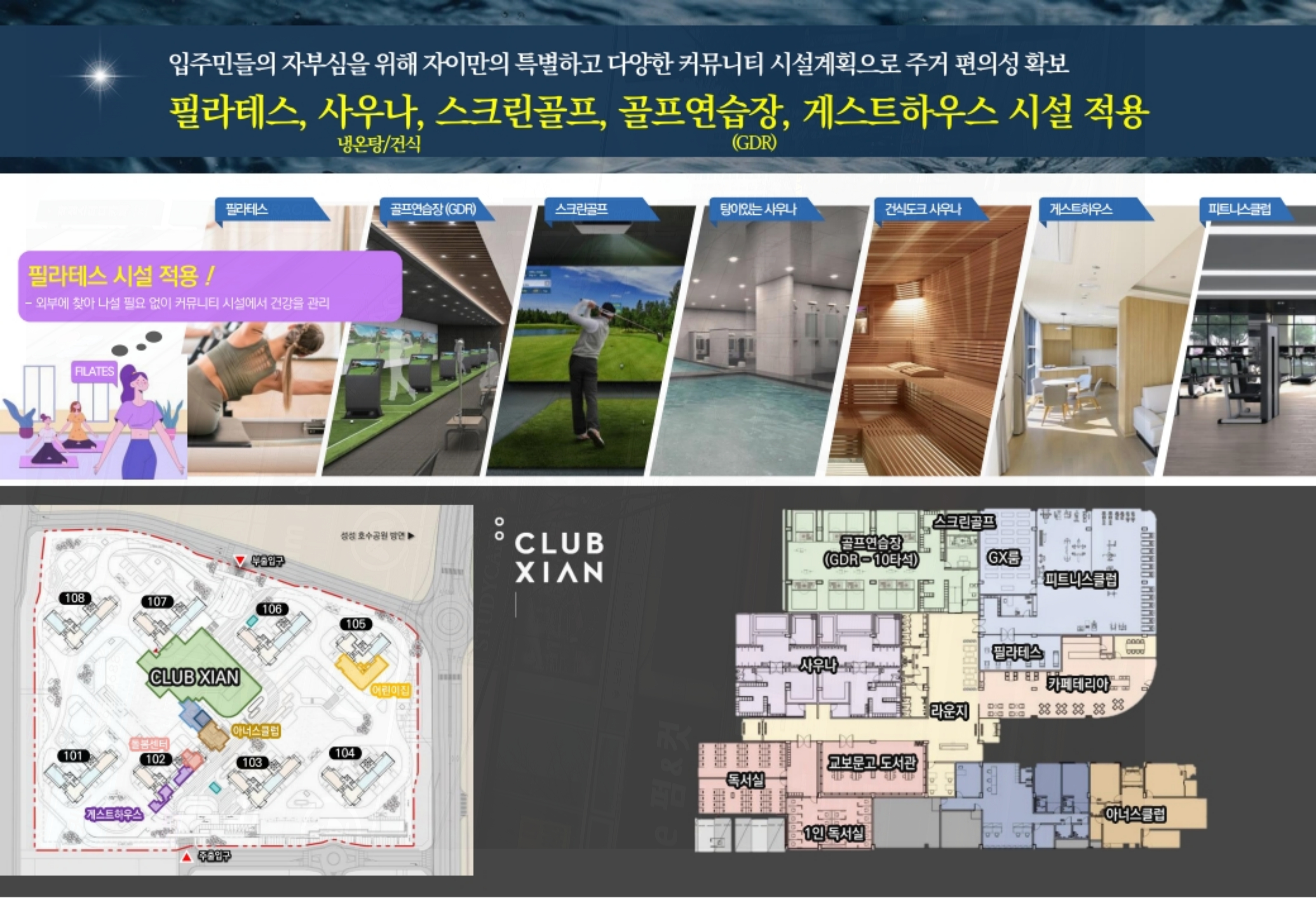 스크린 골프와 실내 골프연습장, 피트니스센터, 사우나 등 다양한 시설이 마련되어 입주민들에게 건강하고, 활기차며 여유로운 라이프스타일을 제공할 것 같습니다.