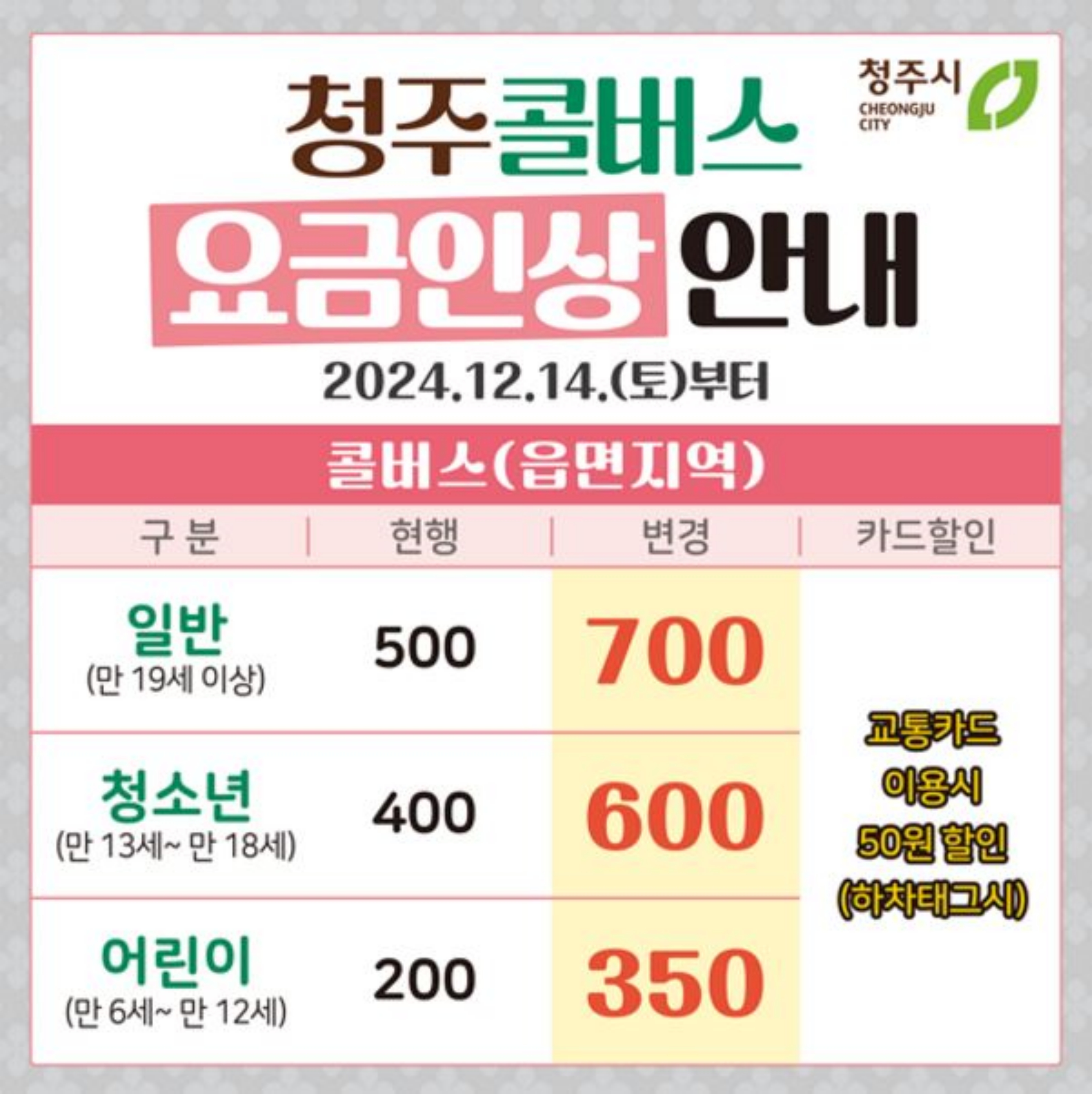 청주시 12월14일부터 콜버스 행복택시 요금 인상