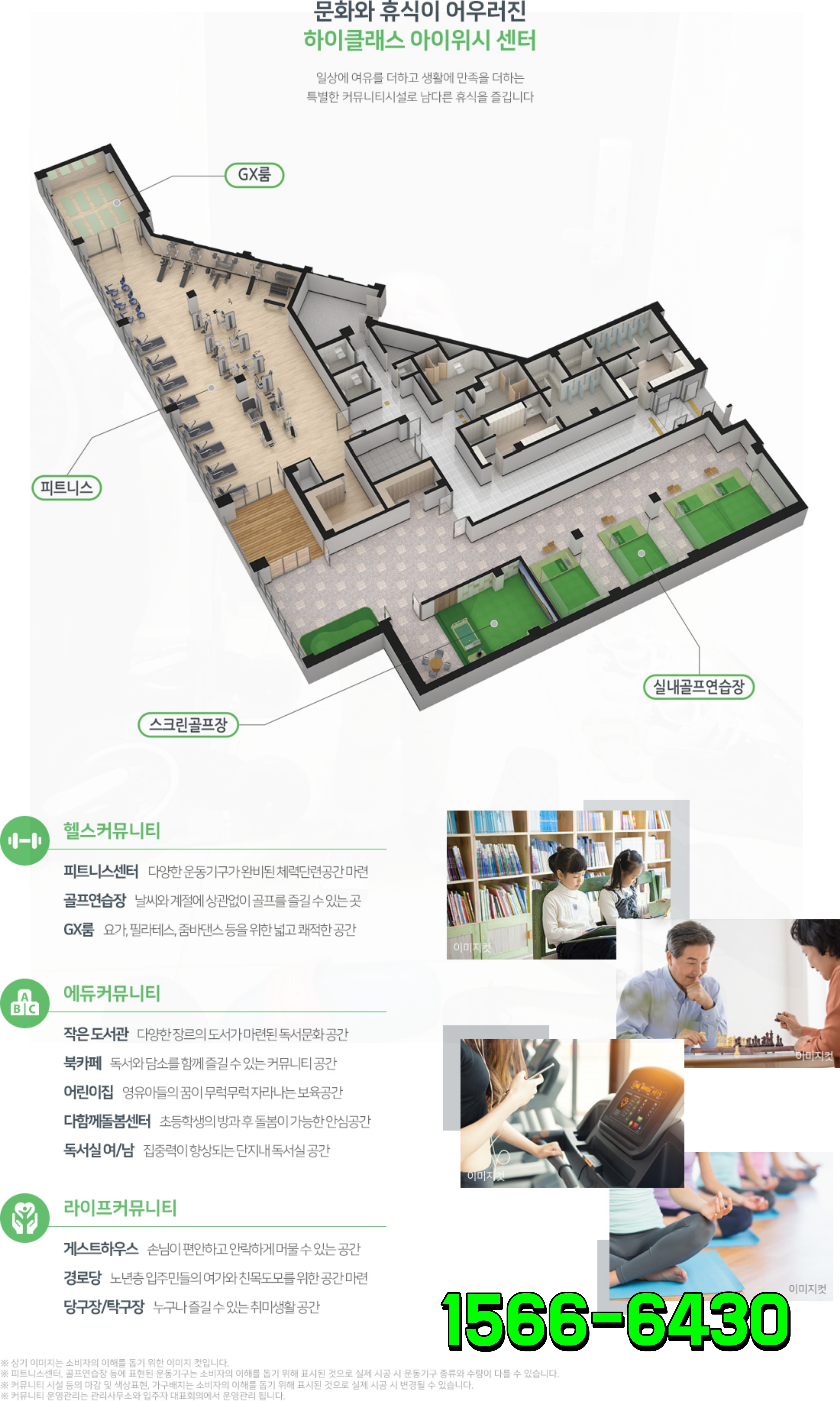 피트니스센터와 실내 골프연습장, 스크린골프장과 같은 체육 스포츠 시설에 정적인 공간도 설계가 되어 있는데요.