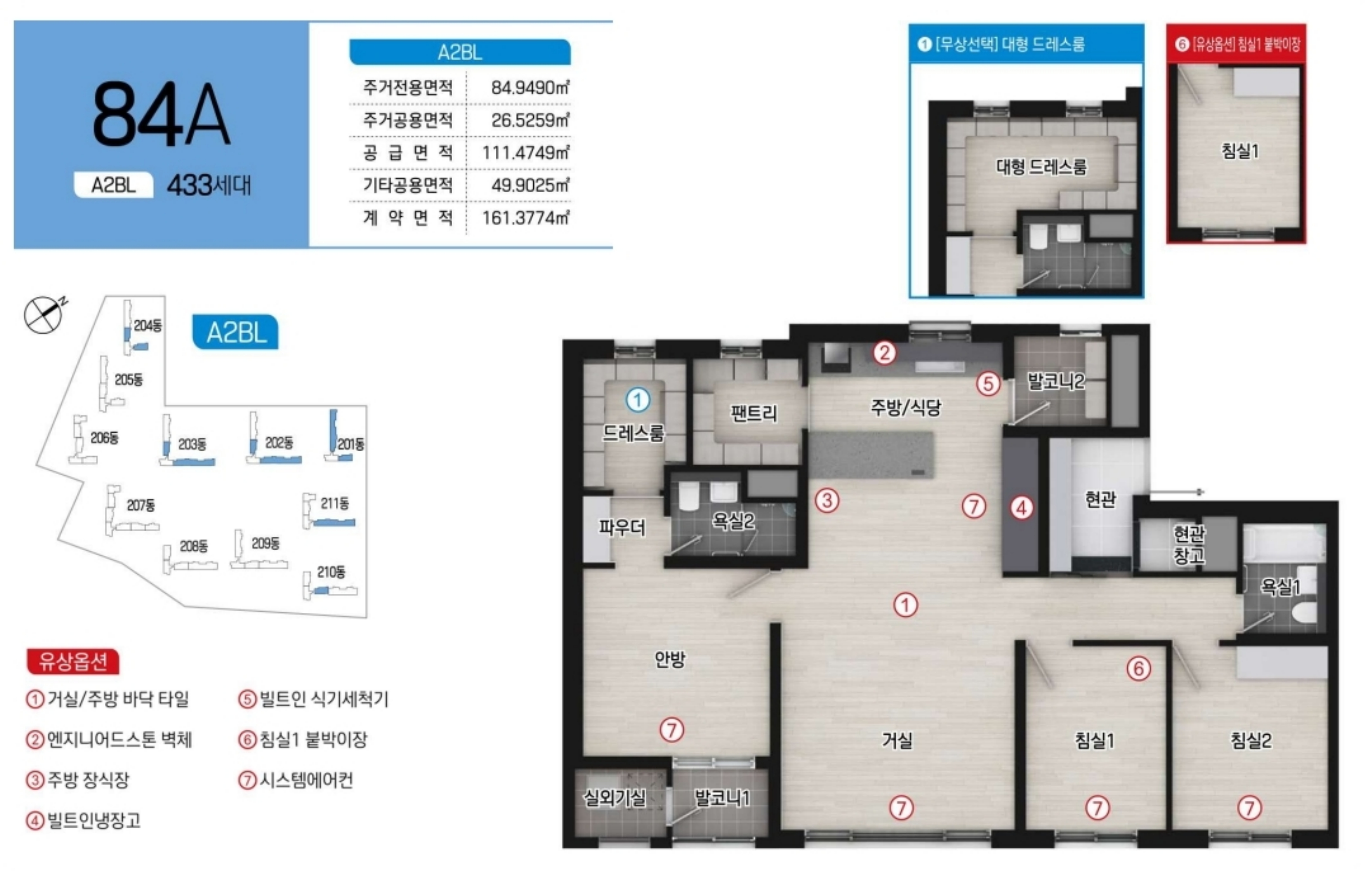 세대 구성은 84㎡ 타입 4종과 99㎡ 타입 3종, 총 7개 타입으로 구성되어 있으며, 대부분 가족 중심의 3침실 2욕실 구조에 광폭 팬트리, 드레스룸, 현관 창고 등 수납공간이 우수합니다.