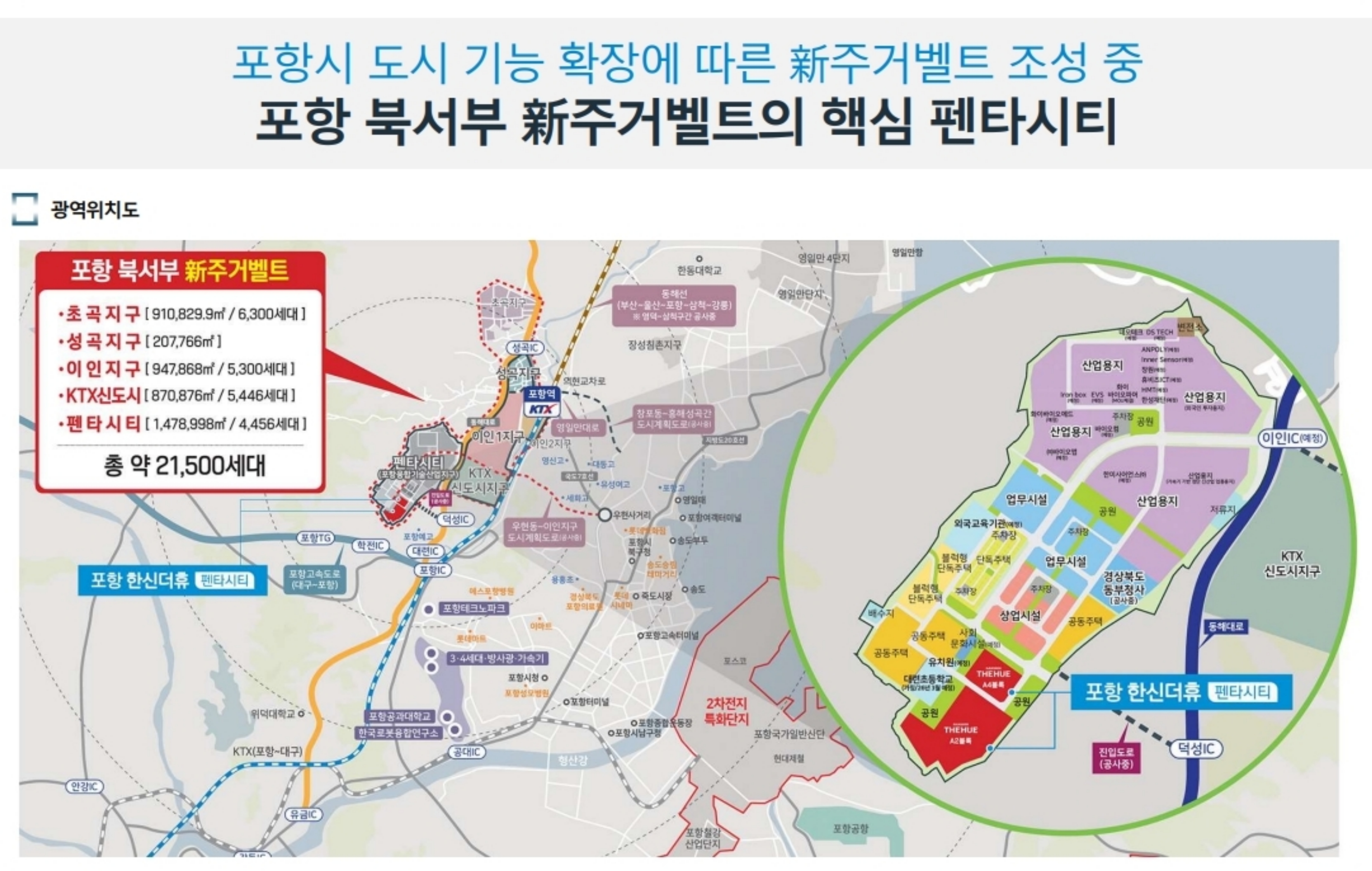 도시 성장과 경제 활성화의 중심에 선 포항 펜타시티 한신더휴 단지는 경북 포항시 북구 흥해읍 대련리 일원에 조성된 대규모 브랜드 아파트 단지로, 총 2,192세대에 이르는 초대형 주거복합타운입니다.