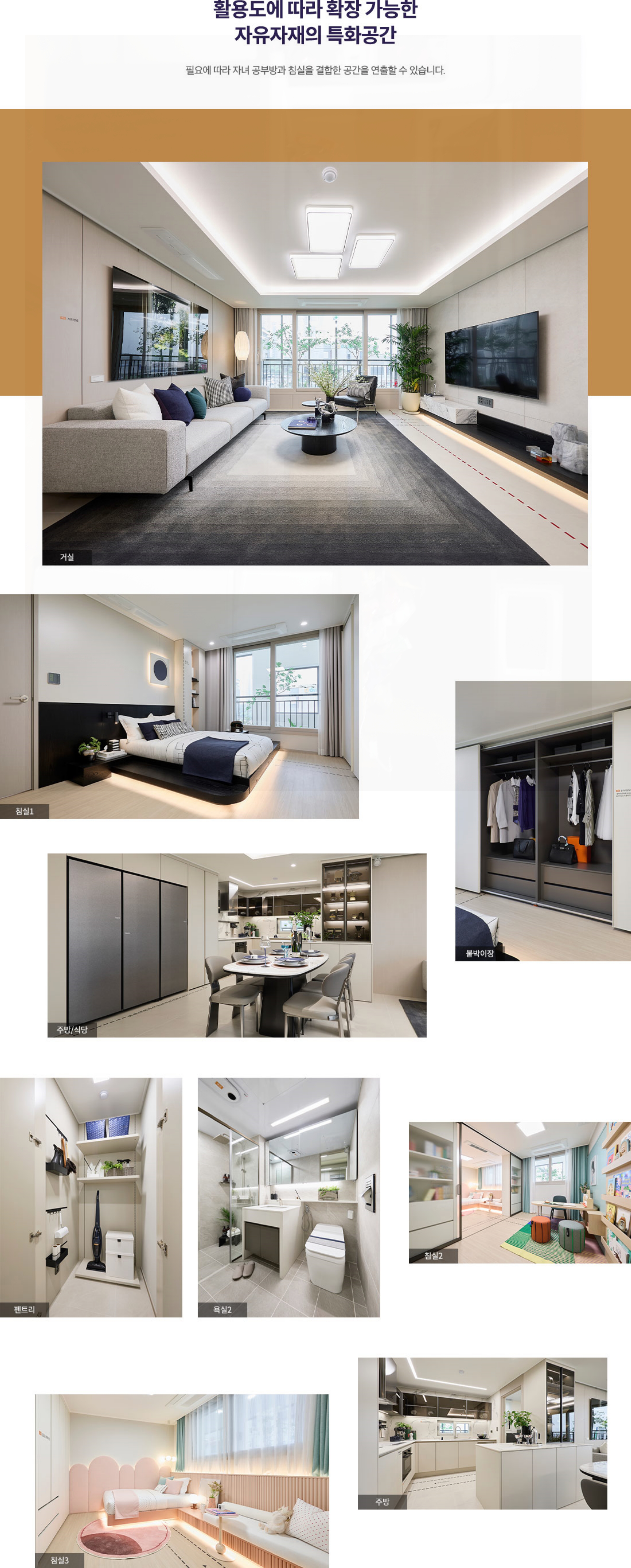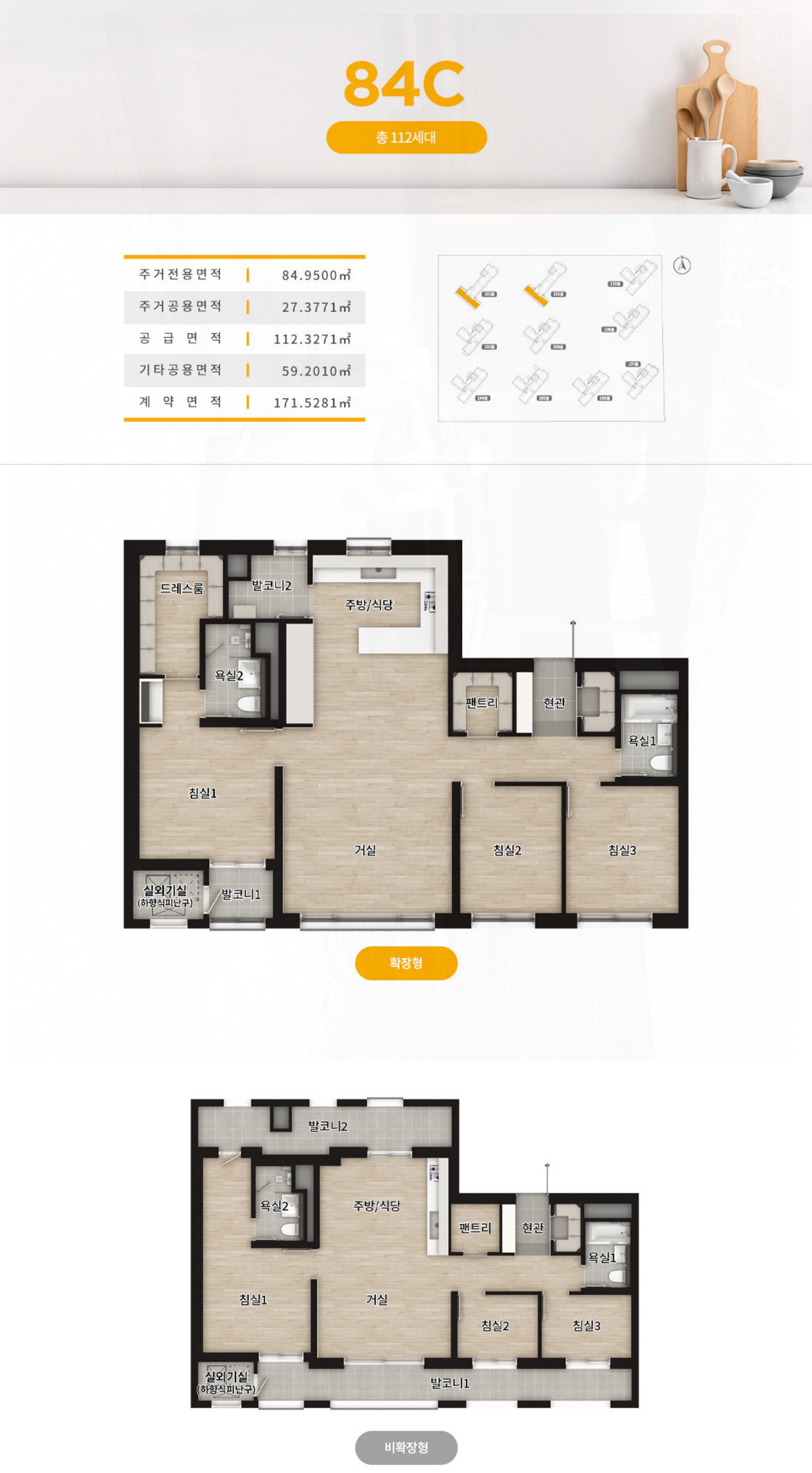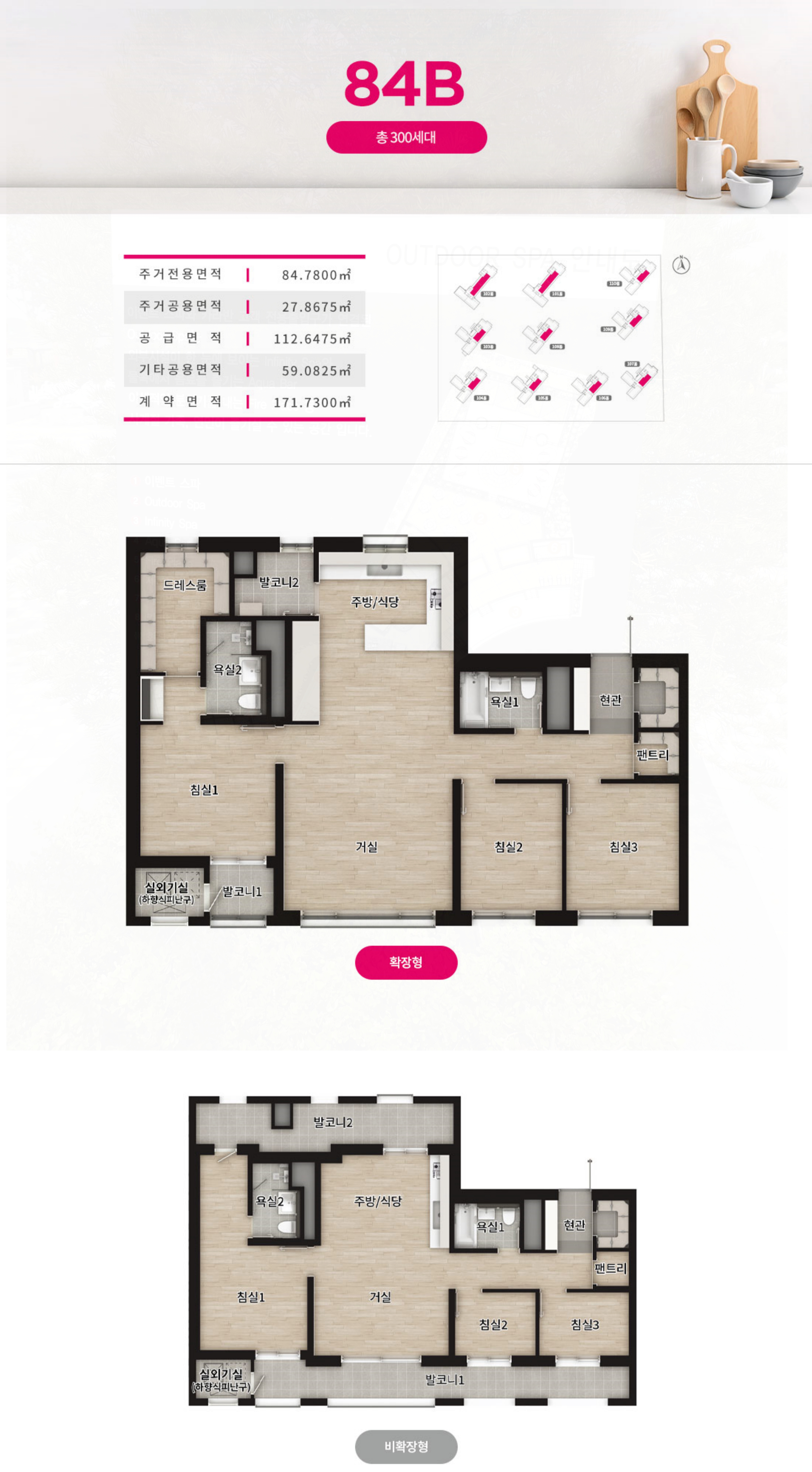 84B는 ㄷ자형 설계의 주방으로 실용적이며 대형 드레스룸으로 활용도가 뛰어나고요.
