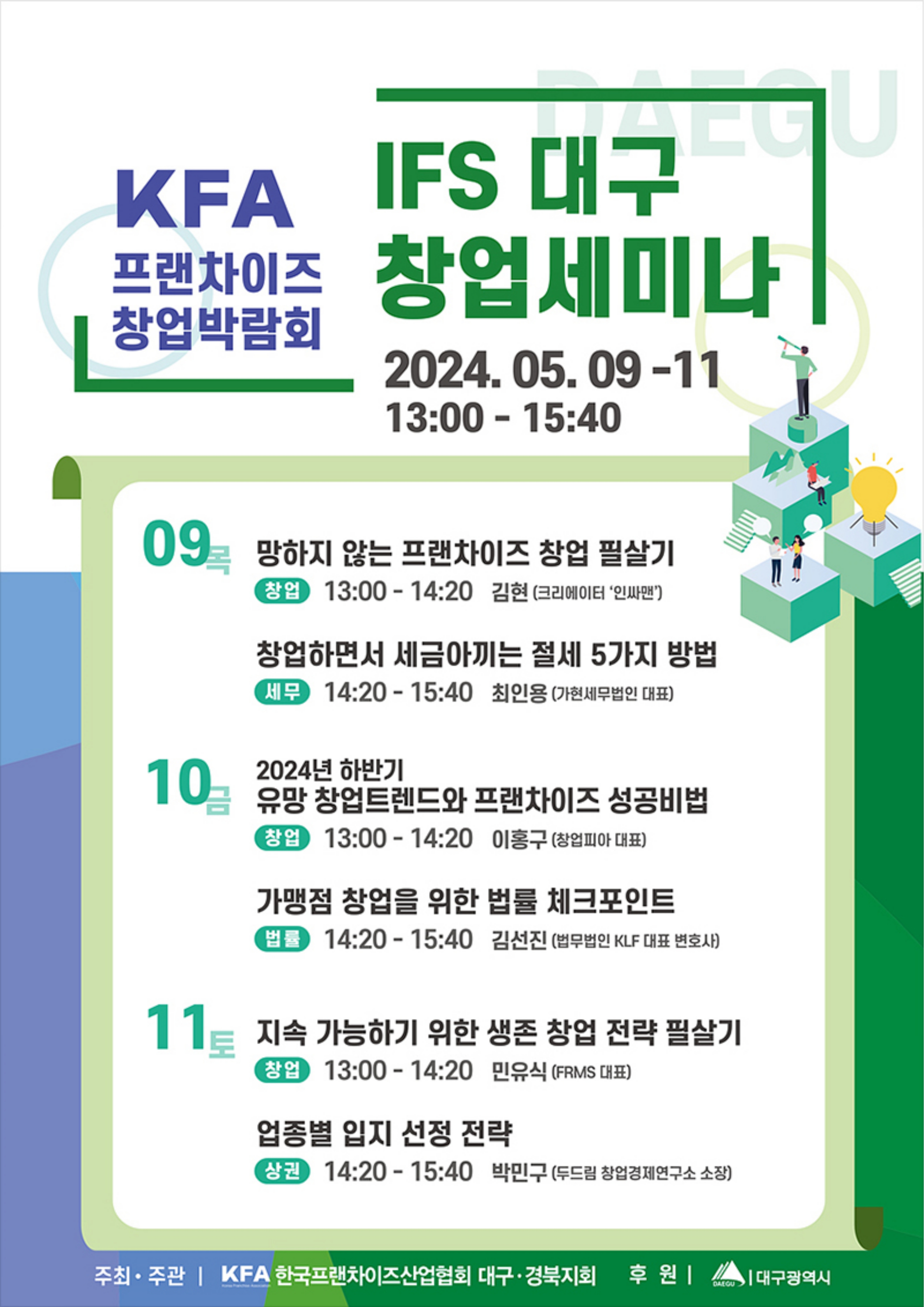 대구광역시와 한국프랜차이즈산업협회 대구경북지회는 오는 5월 9일(목)부터 11일(토)까지 3일간 2024 대구 프랜차이즈 창업 박람회를 엑스코 2홀에서 개최한다.