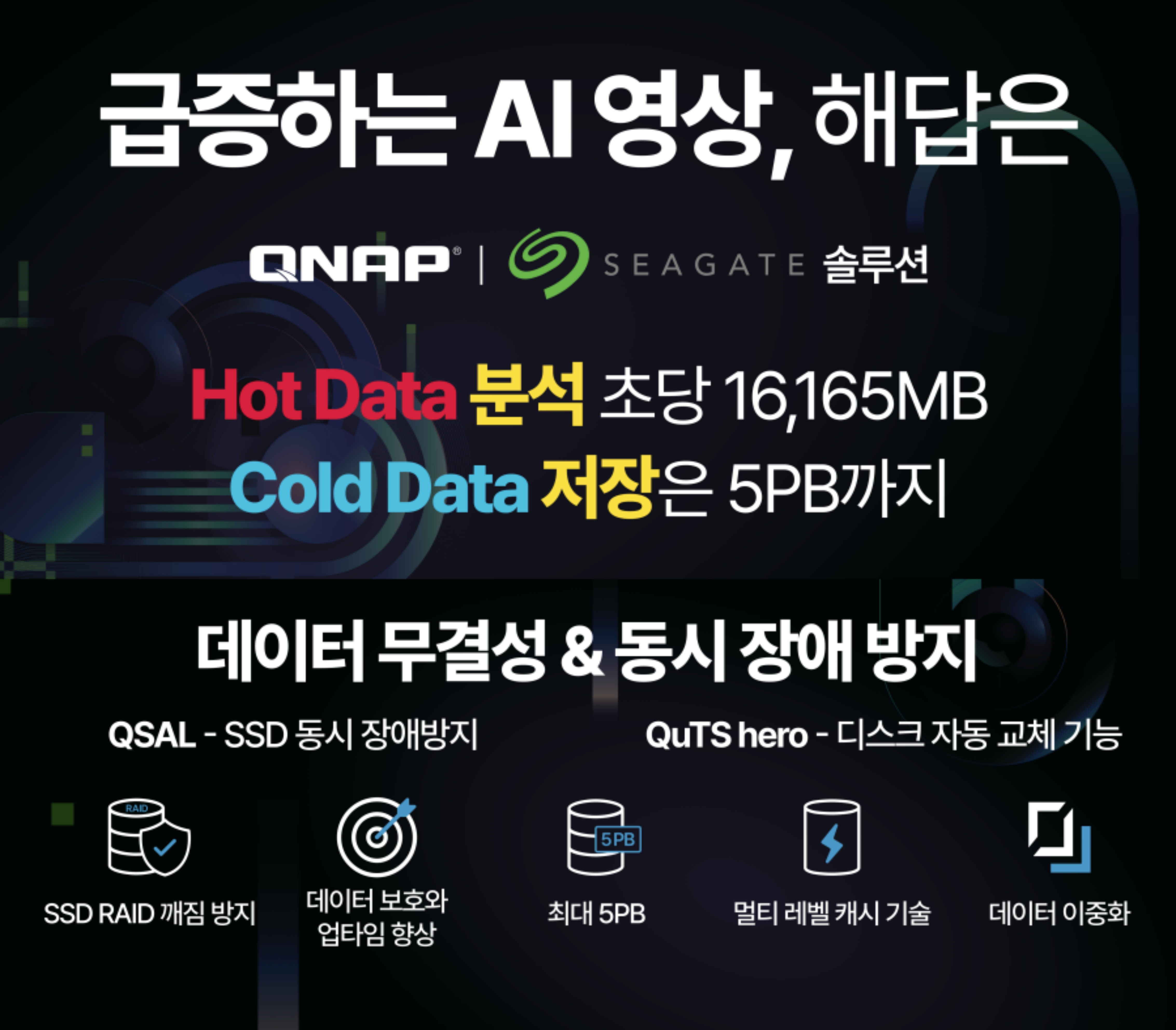 큐냅은 씨게이트(부스 번호 Z091)의 파트너로서 참여해 급증하는 AI 영상, 해답은 QNAP | SEAGATE 솔루션이라는 테마 아래, TDS-h2489FU NAS를 씨게이트 EXOS E 5U84에 연결해 초당 1만6165MB의 핫데이터 분석과 최대 5PB 콜드데이터 저장이 가능한 솔루션을 선보인다.
